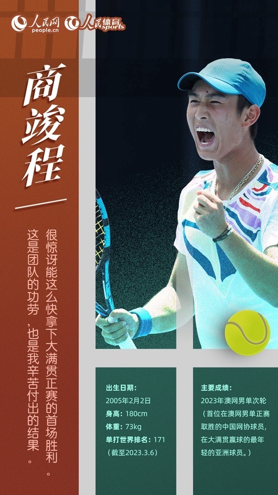 在今年的澳網(wǎng)賽場上,不滿18歲的商竣程讓人眼前一亮。資格賽連贏三場,首次參加大滿貫成人組賽事即打入正賽。正賽首輪,商竣程擊敗30歲的德國選手奧斯卡·奧特,取得大滿貫首勝,這也是公開賽年代以來中國網(wǎng)協(xié)球員在澳網(wǎng)男單正賽取得的首場勝利。盡管未能闖過第二輪,但作為本屆澳網(wǎng)男單正賽中最年輕的球員,商竣程在賽場上的沉穩(wěn)表現(xiàn),讓人們對(duì)于這名小將的未來有了更多期待。