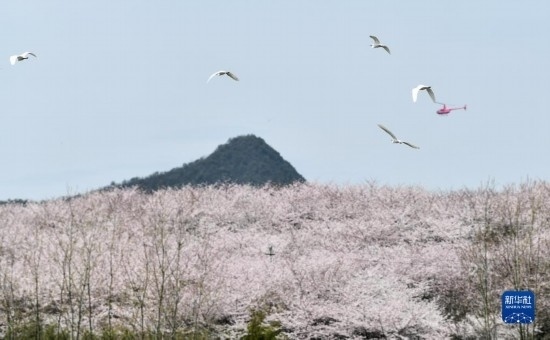 3月21日,一群鳥在貴州省貴安新區(qū)櫻花園內(nèi)飛翔。