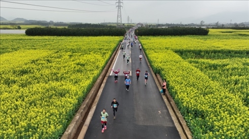 來自海內(nèi)外的1萬余名專業(yè)運(yùn)動(dòng)員和馬拉松愛好者在云南羅平縣的花海中奔跑。何新文攝
