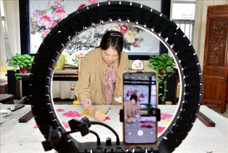 河南省洛陽市孟津區(qū)平樂鎮(zhèn)中國牡丹畫創(chuàng)意園區(qū),村民正在通過網(wǎng)絡(luò)直播推介牡丹畫。李衛(wèi)超攝