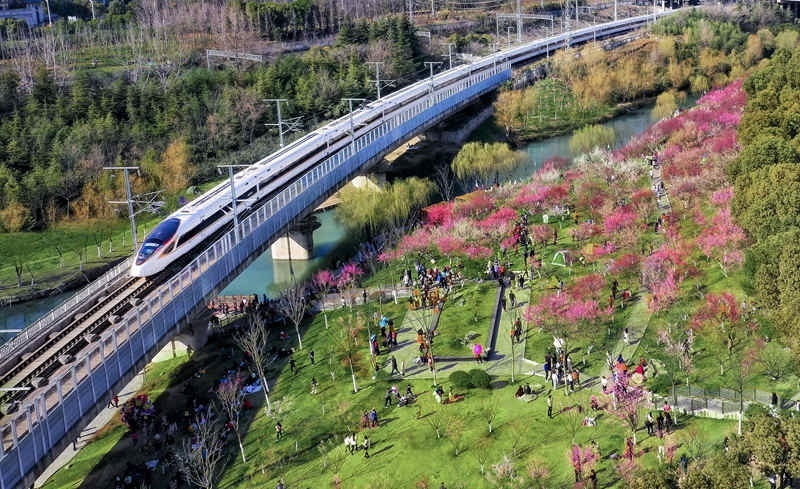 一列動車組列車從合肥市匡河公園邊駛過。中國鐵路上海局集團(tuán)有限公司供圖