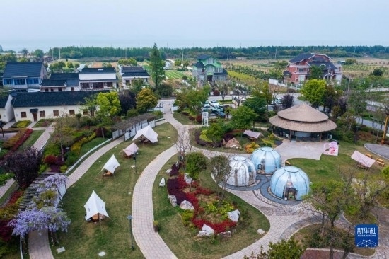 4月11日拍攝的伍浦村漁耕文化園的陶灣里鄉(xiāng)村咖啡店以及鄉(xiāng)村露營地(無人機照片)。