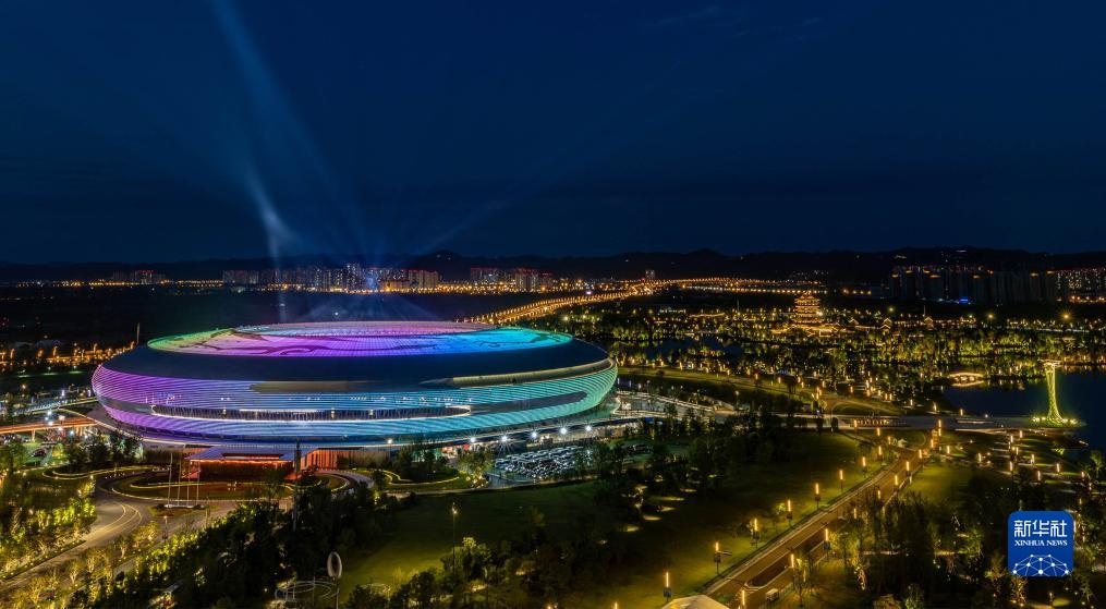 這是7月28日拍攝的東安湖體育公園主體育場(chǎng)夜景。