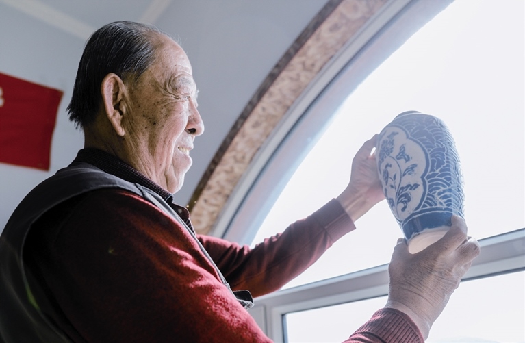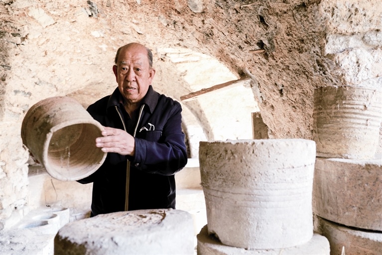 隨后,他走進“饅頭窯”旁邊的一口窯洞,這是當時張家的一間手工作坊,揉泥、拉坯、上釉等一系列制作陶瓷的工序都是在這里完成?!拔揖统錾谶@個村子,已經(jīng)是張家瓷藝的第九代傳人了。作為中國磁州窯譜系,清水河黑礬溝瓷藝生產(chǎn)歷史至少已有800年?!标P(guān)于這項非遺的歷史故事,張選老人向記者娓娓道來:大約400年前,他們張家走西口從山西來到清水河謀生,當時清水河黑礬溝有一家姓杜的人家做陶瓷營生,張家的先人在杜家打工,大概這樣打工做了三輩人吧,杜家忽然不做了,搬離了黑礬溝,他們張家便把杜家的產(chǎn)業(yè)買了下來繼續(xù)做。“那個時候黑礬溝生產(chǎn)的瓷器都與人們生活息息相關(guān),比如腌菜缸、水甕、碗盤等,一個家庭手工作坊一天能生產(chǎn)500個碗呢,生意很好,人們靠做這個營生也過上了不錯的生活。”張選回憶著清水河瓷藝鼎盛時期的場景。上個世紀70年代,由于交通、技術(shù)等原因,黑礬溝燃燒了幾百年的窯火熄滅,傳統(tǒng)“饅頭窯”被正式廢棄,轉(zhuǎn)移到窯溝鄉(xiāng)后手工作坊變成了機械化生產(chǎn),這也讓清水河的陶瓷名聲大噪。當時,在窯溝鄉(xiāng)一帶,從事陶瓷生產(chǎn)的有近萬人,陶瓷業(yè)成為清水河支柱產(chǎn)業(yè)。