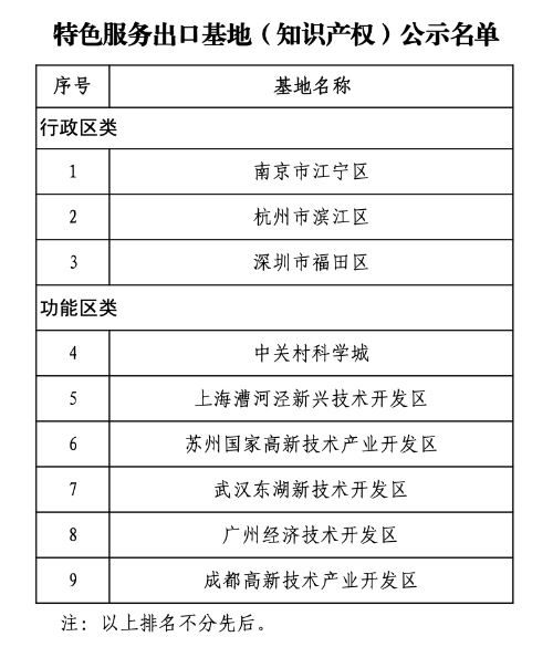 據(jù)國家知識產(chǎn)權局官網(wǎng)消息,根據(jù)《商務部等7部門辦公廳(室)關于組織申報專業(yè)類特色服務出口基地的通知》(商辦服貿函〔2021〕355號)要求,經(jīng)地方申報、省市知識產(chǎn)權和商務主管部門初審推薦、第三方機構客觀指標評審、專家評審、部門工作組復核等程序,初步認定知識產(chǎn)權服務出口基地9家,名單于2月7日-2月11日進行公示。