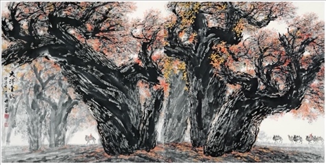 梁先生曾旅居西藏四個(gè)月,不僅為人民大會(huì)堂西藏廳創(chuàng)作了巨幅國(guó)畫《雪山雄鷹》,同時(shí)收獲了數(shù)百?gòu)埶賹懞蛯懮?。他還四上黃山,兩次到三峽。2000年,70多歲的梁世雄又深入新疆無(wú)人區(qū)胡楊林中進(jìn)行素材收集。此后,大漠胡楊成了梁世雄作品新的視覺(jué)符號(hào)。