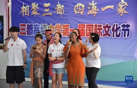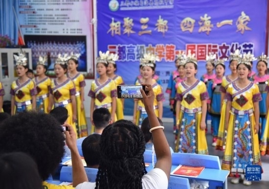 6月5日,來華留學(xué)生在三都高級中學(xué)第一屆國際文化節(jié)上演唱歌曲。