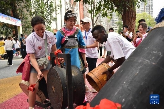 6月5日,參加三都高級中學(xué)第一屆國際文化節(jié)的來華留學(xué)生體驗(yàn)敲擊銅鼓。