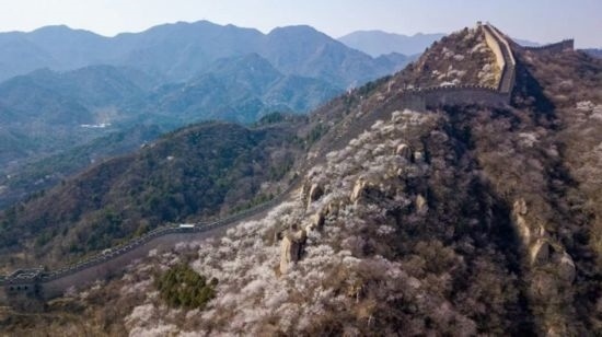 仲春時節(jié),八達嶺東段的水關(guān)長城山花爛漫,自然與人文景觀交相輝映。(新華社發(fā)陳鐘昊 攝)