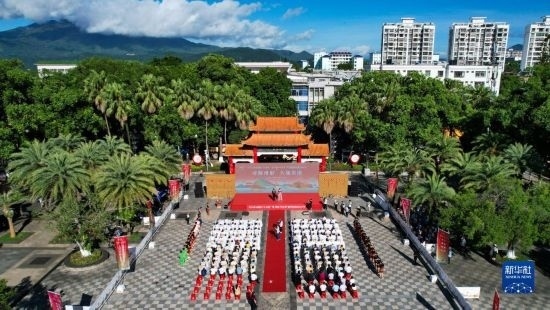 這是7月8日拍攝的五指山“上山爽一夏 故園·畢業(yè)季”暨州府故園文化節(jié)啟動(dòng)儀式現(xiàn)場(chǎng)(無人機(jī)照片)。