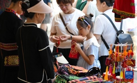 7月8日,游客在五指山三月三廣場(chǎng)選購(gòu)黎族特色產(chǎn)品。