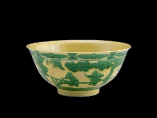 清同治·景德鎮(zhèn)窯黃地綠釉嬰戲圖碗。色地彩瓷是以各種不同的顏色釉為地,再施一種彩為飾,各種色彩互相交錯(cuò)使用,形成“一地一彩”的瓷器,如黃地綠彩、綠地紫彩、綠地黃彩、紅地黃彩、紫地綠彩等多種色地彩瓷。屬低溫彩釉,最早在明代永樂時(shí)期出現(xiàn)。(圖片來(lái)源:上海博物館)