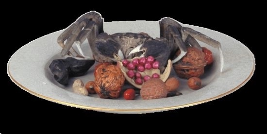 清乾隆·粉彩像生瓷果品盤。盤中諸果品不但酷似實(shí)物,而且都具有吉祥含義,如螃蟹寓意“一甲”,即科舉殿試第一;荔枝樹有“經(jīng)四百余年猶能結(jié)實(shí)者”之說(shuō),象征長(zhǎng)壽;核桃、石榴是多子多福的象征;而棗、花生、瓜子等則寓意“早生貴子”。(圖片來(lái)源:故宮博物院)