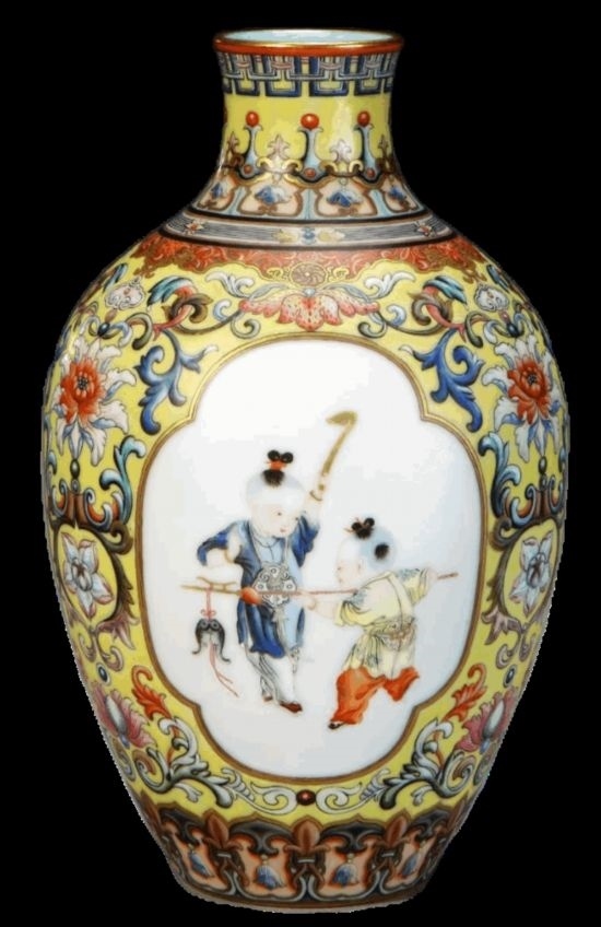 清乾隆·黃地琺瑯彩開光嬰戲紋瓶。開光是指在器物的顯著部位以線條勾勒出圓形、方形、菱形、扇面形、云頭形或花形等多種式樣的欄框,框內(nèi)繪各種圖案,起到突出主題紋飾的作用。此法猶如古建筑上開窗見光,故名開光。(圖片來(lái)源:故宮博物院)