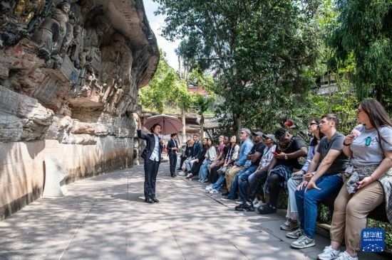 3月27日,游客在大足石刻景區(qū)參觀。