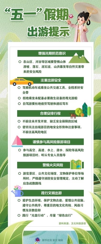 文化和旅游部近日發(fā)布“五一”假期出游提示,提醒廣大游客增強汛期防范意識、注重出游安全、合理安排行程、謹慎參與高風(fēng)險旅游項目、警惕火災(zāi)風(fēng)險、踐行文明出游。