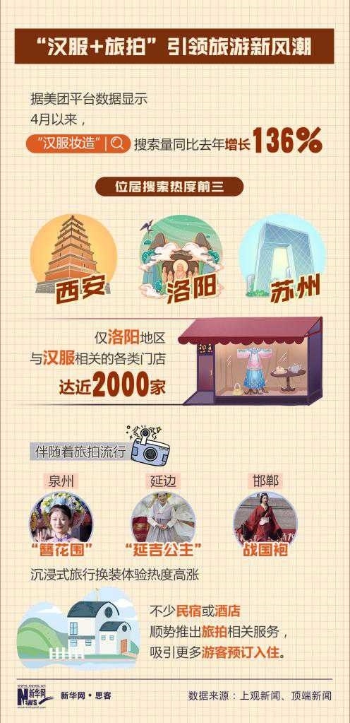 美團(tuán)平臺(tái)數(shù)據(jù)顯示,4月以來,“漢服妝造”搜索量同比增長136%。西安、洛陽等街頭,隨處可見身著漢服的年輕人在博物館、遺址公園等景區(qū)打卡拍照,摩肩接踵間皆是“貴妃”,文博景區(qū)附近不少商鋪以漢服妝造店為主。不少民宿或酒店,順勢(shì)推出旅拍服務(wù),吸引更多年輕人預(yù)定入住。