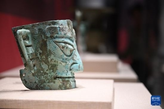 這是5月18日在“問蜀——東周時期的蜀文化展”上拍攝的四川廣漢三星堆遺址出土的銅人面具。