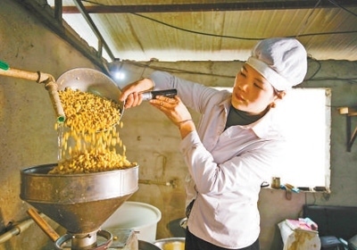 貴州省貴陽市修文縣久長(zhǎng)鎮(zhèn)孟沖村一家豆腐加工作坊,工作人員將大豆舀入打漿機(jī)加工。周訓(xùn)超攝(人民視覺)