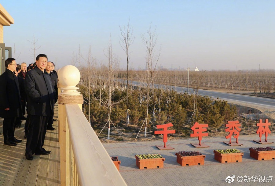 雄安新區(qū)堅(jiān)持生態(tài)優(yōu)先、綠色發(fā)展,率先啟動(dòng)生態(tài)基礎(chǔ)設(shè)施建設(shè)和環(huán)境整治,目前已完成11萬畝“千年秀林”建設(shè)。16日下午,習(xí)近平總書記來到“千年秀林”大清河片林一區(qū)造林區(qū)域,乘車穿行林區(qū)察看林木長勢,登上秀林驛站二層平臺(tái)遠(yuǎn)眺林區(qū)全貌,同當(dāng)?shù)刈o(hù)林員代表親切交流。他說,藍(lán)天、碧水、綠樹,藍(lán)綠交織,將來生活的最高標(biāo)準(zhǔn)就是生態(tài)好。雄安新區(qū)過去有一定的基礎(chǔ),現(xiàn)在搞“千年秀林”,將來這里一定是最宜居的地方。綠水青山就是金山銀山,雄安新區(qū)就要靠這樣的生態(tài)環(huán)境來體現(xiàn)價(jià)值、增加吸引力。(記者張曉松、謝環(huán)馳、鞠鵬)