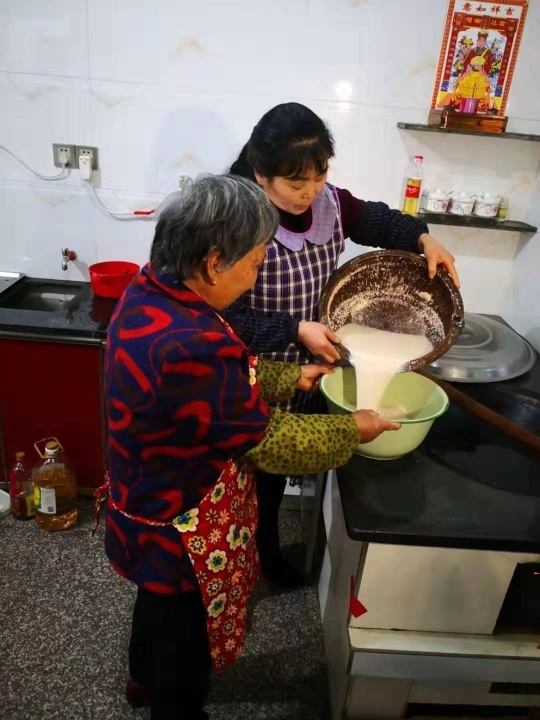 △這是邱彩立(右)和鄰居一起做擂茶