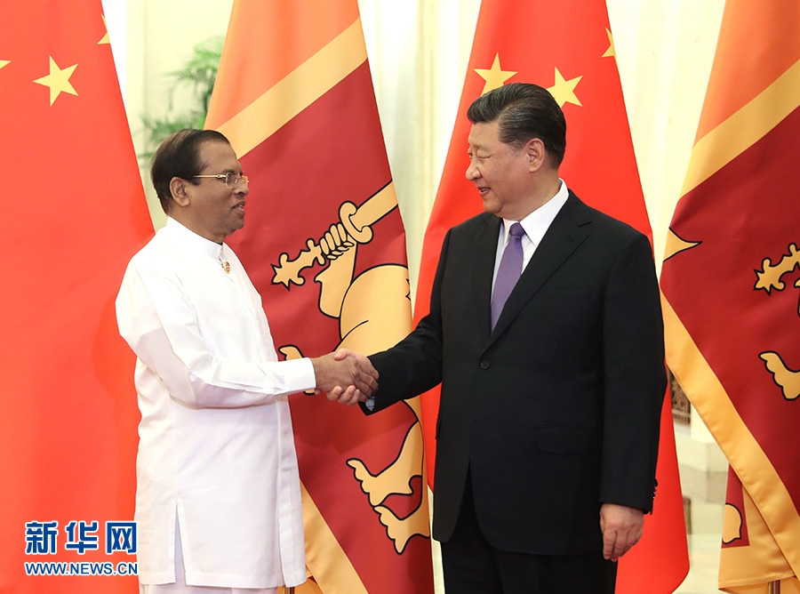5月14日,國家主席習近平在北京人民大會堂會見來華出席亞洲文明對話大會的斯里蘭卡總統(tǒng)西里塞納。 新華社記者 姚大偉 攝