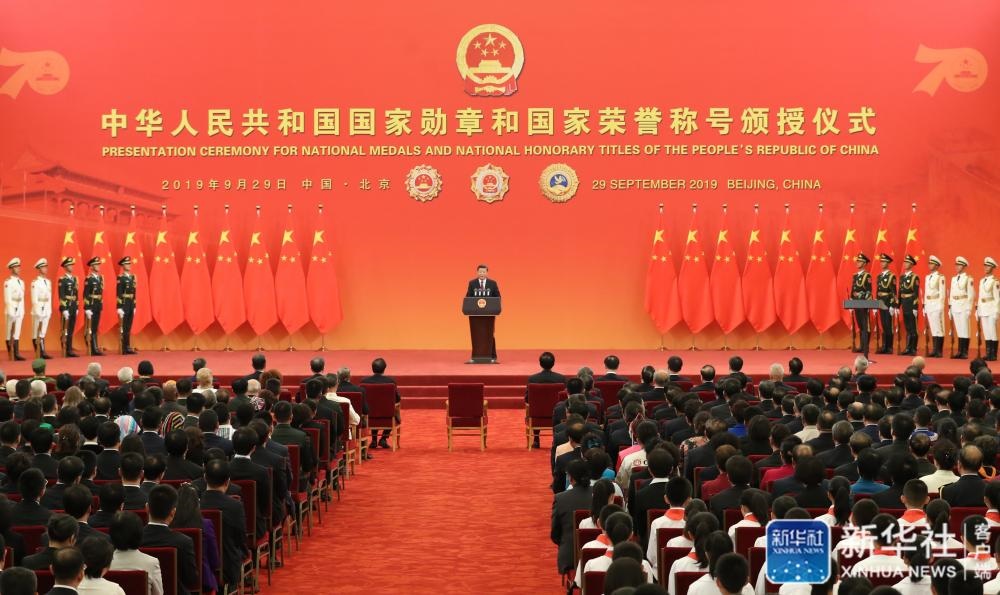 ↑9月29日,中華人民共和國國家勛章和國家榮譽(yù)稱號頒授儀式在北京人民大會(huì)堂金色大廳隆重舉行。中共中央總書記、國家主席、中央軍委主席習(xí)近平向國家勛章和國家榮譽(yù)稱號獲得者頒授勛章獎(jiǎng)?wù)虏l(fā)表重要講話。新華社記者鞠鵬攝