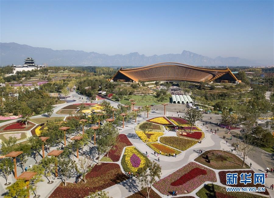 這是北京世園會(huì)園藝小鎮(zhèn)(10月7日無(wú)人機(jī)拍攝)。