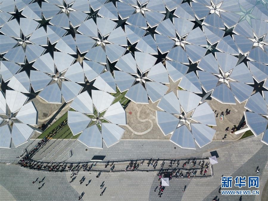 游客在北京世園會(huì)國(guó)際館前排隊(duì)參觀(10月7日無(wú)人機(jī)拍攝)。