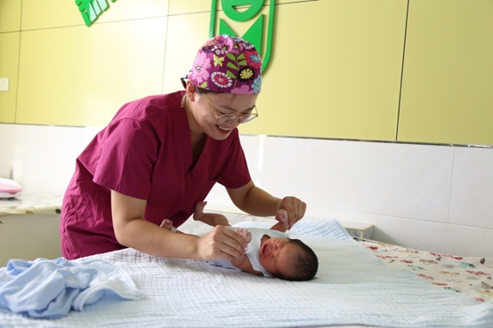 烏拉特前旗人民醫(yī)院護(hù)士為新生兒洗浴、撫觸。