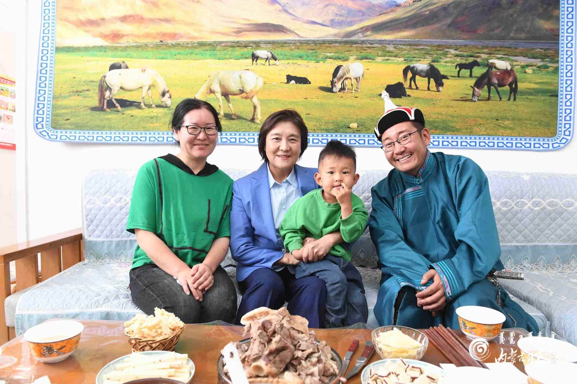 6月8日,自治區(qū)黨委副書記、自治區(qū)主席布小林在巴彥淖爾市烏拉特中旗調(diào)研,她來到希日朝魯嘎查牧戶呼斯勒家走訪,并與他們一家合影留念。內(nèi)蒙古日報社融媒體記者 韓卿立攝