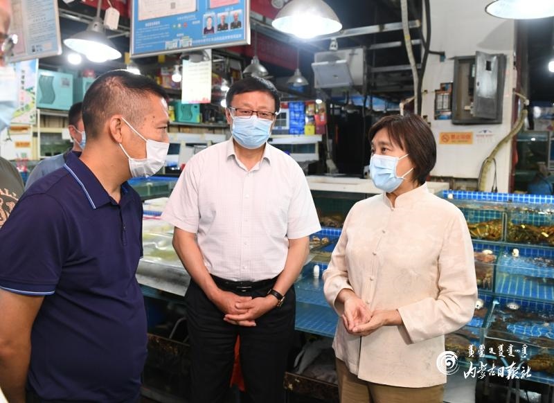 6月22日,自治區(qū)黨委副書記、自治區(qū)主席、自治區(qū)新冠肺炎疫情防控工作指揮部總指揮布小林,自治區(qū)副主席、自治區(qū)防控工作指揮部副總指揮歐陽(yáng)曉暉來(lái)到位于呼和浩特市賽罕區(qū)的融橋海鮮市場(chǎng),了解海鮮和水產(chǎn)品產(chǎn)地、物流運(yùn)輸、銷量變化等情況。內(nèi)蒙古日?qǐng)?bào)社融媒體記者 韓卿立 攝