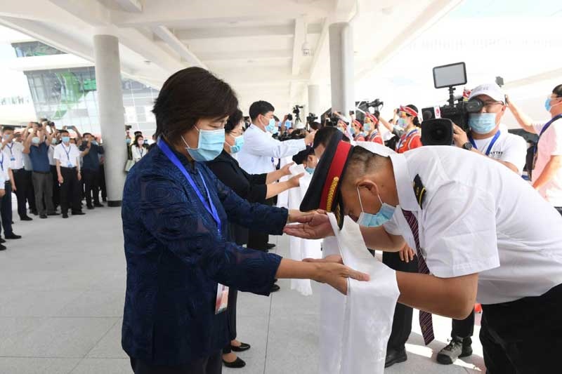 自治區(qū)黨委副書記、自治區(qū)主席布小林宣布赤喀高鐵正式開通運營,并與自治區(qū)副主席艾麗華、自治區(qū)政府秘書長包振玉以及中國鐵路沈陽局集團有限公司、蒙遼鐵路客運專線有限責(zé)任公司、赤峰市委負責(zé)同志一起為列車組人員敬獻哈達。