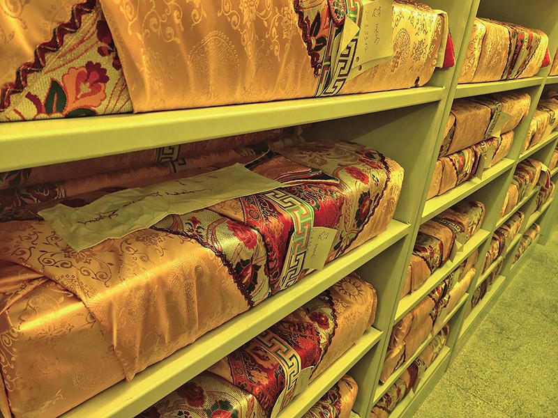 走入蒙古文古籍庫(kù),上萬(wàn)件古籍靜靜地?cái)[放著,在昏黃的特殊燈光照射下,一排排書架金光閃閃,一個(gè)個(gè)防磁柜就像知識(shí)的巨人并肩站立,歷史在這里塵封,也在這里開啟。