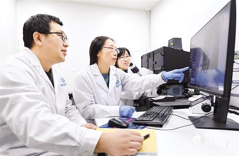 內(nèi)蒙古大學生命科學學院院長、省部共建草原家畜生殖調(diào)控與繁育國家重點實驗室主任胡薇(中)與團隊成員觀察動物的成纖維細胞結(jié)構(gòu)形態(tài)。內(nèi)蒙古日報社融媒體記者