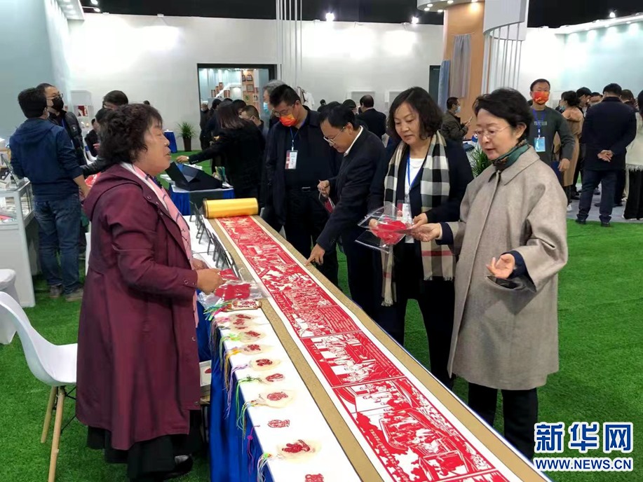 參會嘉賓在傳統(tǒng)手工藝品、文創(chuàng)產(chǎn)品展覽展示區(qū)參觀。新華網(wǎng) 李國棟 攝