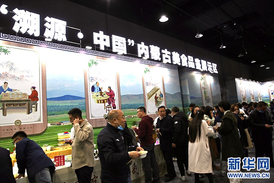 “溯源中國”內(nèi)蒙古美食品鑒展示區(qū)里,觀眾品鑒內(nèi)蒙古美食。新華網(wǎng) 石毅 攝