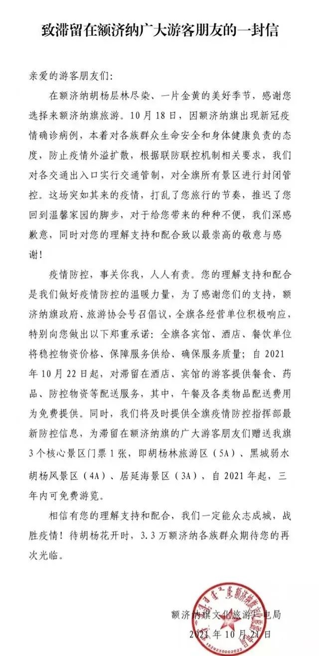 這封公開(kāi)信中寫(xiě)道,自10月22日起,對(duì)滯留在酒店、賓館的游客提供餐食、藥品、防控物資等配送服務(wù),其中,午餐及各類物品配送費(fèi)用為免費(fèi)提供;為滯留游客贈(zèng)送胡楊林旅游區(qū)(5A)、黑城弱水胡楊風(fēng)景區(qū)(4A)、居延海景區(qū)(3A)3個(gè)核心景區(qū)門(mén)票1張,自2021年起,三年內(nèi)可免費(fèi)游覽。