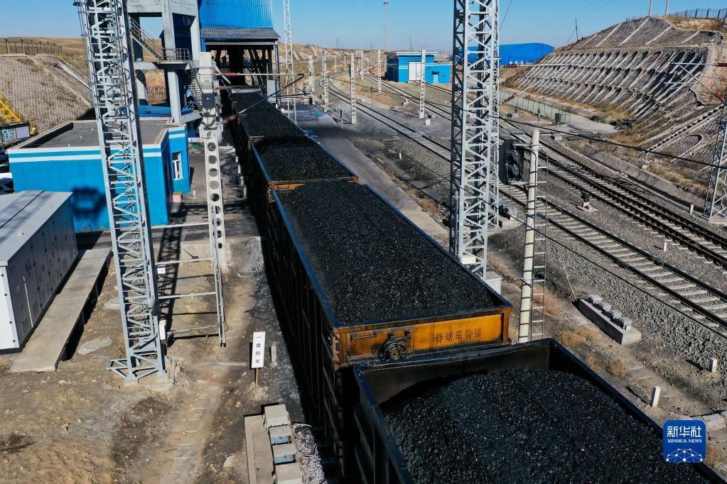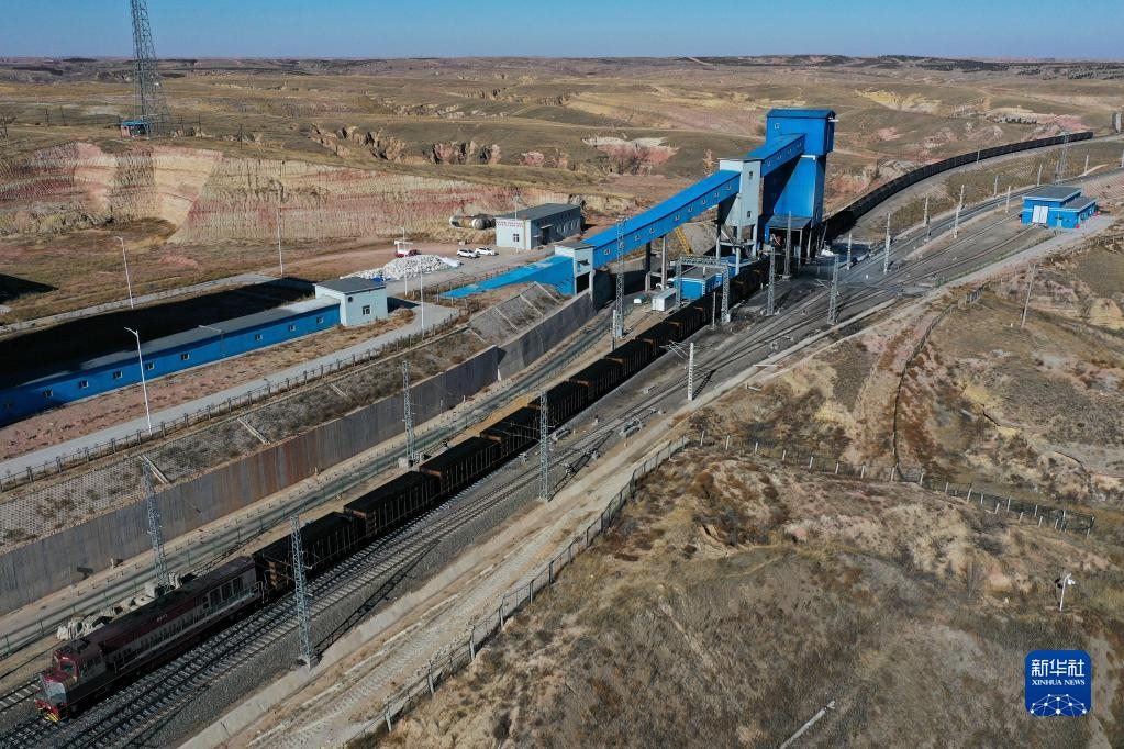 這是11月23日在位于鄂爾多斯市的淮河能源西部煤電集團(tuán)色連二礦罕臺(tái)川集裝站拍攝的正在裝煤的列車(無人機(jī)照片)。新華社記者李志鵬攝