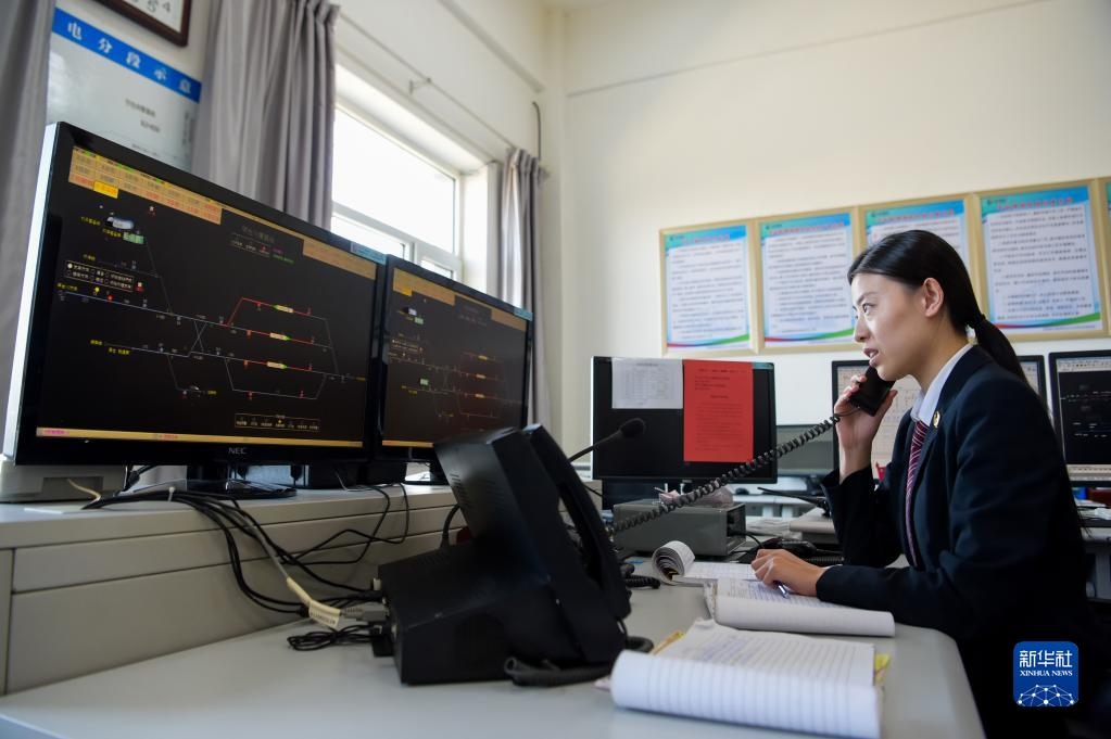 11月23日,在位于鄂爾多斯市的淮河能源西部煤電集團(tuán)色連二礦罕臺(tái)川集裝站,工作人員在調(diào)度運(yùn)煤列車。新華社記者朱文哲攝