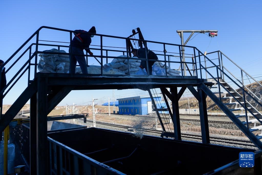 11月23日,在位于鄂爾多斯市的淮河能源西部煤電集團(tuán)色連二礦罕臺(tái)川集裝站,工作人員在給運(yùn)煤列車鋪撒防凍粉。新華社記者李志鵬攝
