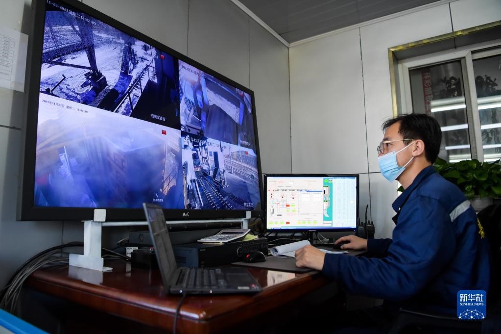 11月23日,在位于鄂爾多斯市的淮河能源西部煤電集團(tuán)色連二礦罕臺(tái)川集裝站,工作人員在監(jiān)控裝煤設(shè)備運(yùn)行情況。新華社記者李志鵬攝