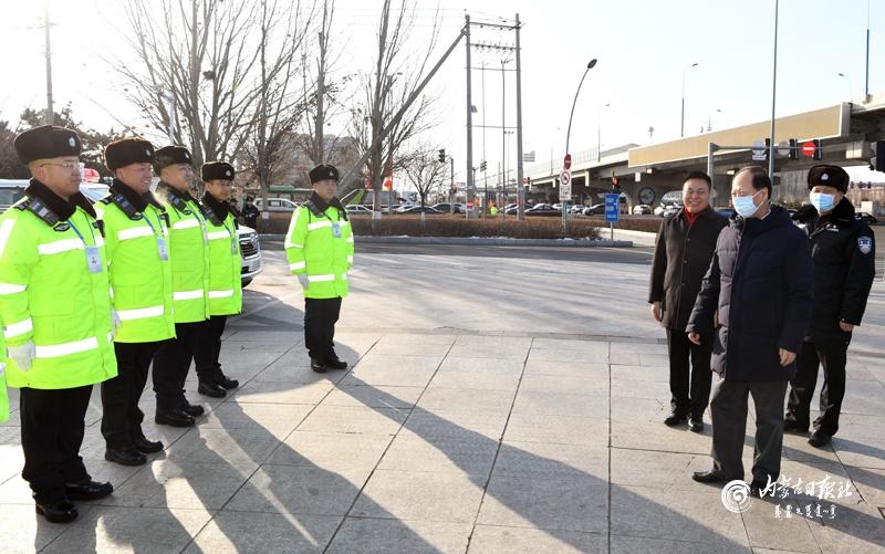 1月31日,自治區(qū)黨委書(shū)記、人大常委會(huì)主任石泰峰,走訪呼和浩特市公安局交警支隊(duì)賽罕大隊(duì)九中隊(duì)崗?fù)ぃ赐繂?wèn)一線執(zhí)勤交警。內(nèi)蒙古日?qǐng)?bào)社融媒體記者袁永紅攝