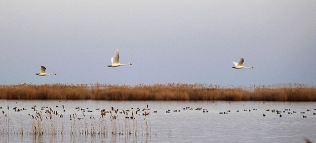 蘆葦蕩漾,鴻雁飛翔。此刻,鳥(niǎo)類(lèi)攝影愛(ài)好者馬海明扛起他的相機(jī),駕著破冰艇駛向?yàn)趿核睾5纳钐帯K届o地說(shuō):“再過(guò)些日子,這里的鳥(niǎo)更多、魚(yú)更歡,拍出來(lái)的照片會(huì)更美更精彩。”