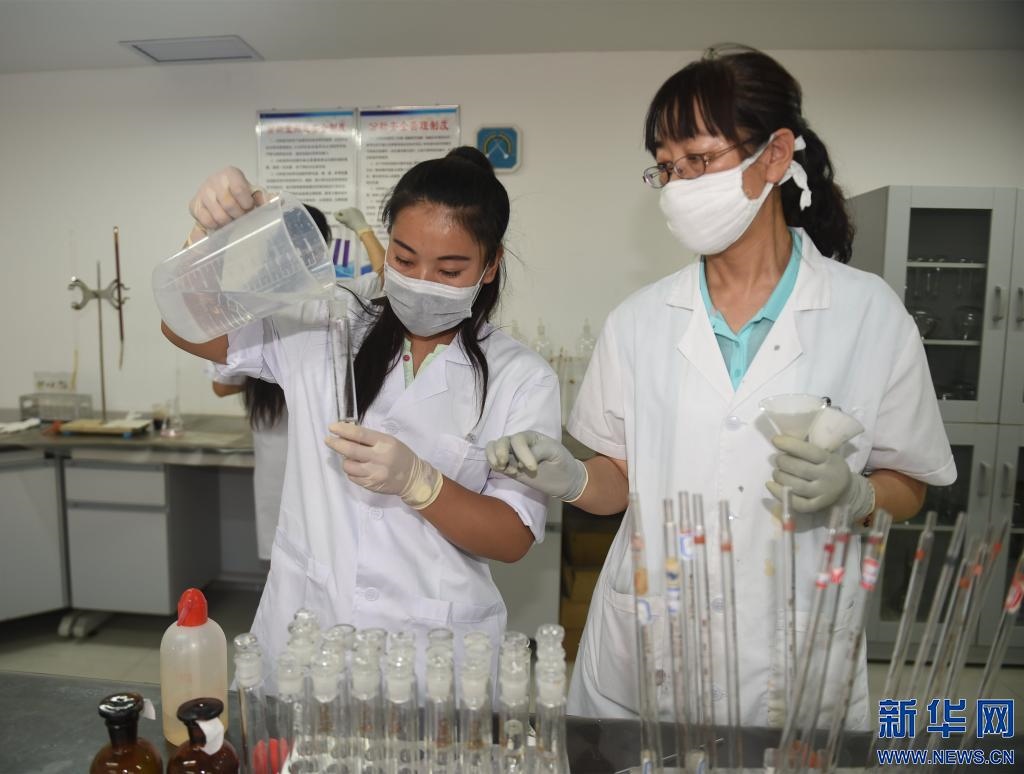 2017年7月12日,巴彥淖爾市農(nóng)村牧區(qū)飲水安全水質(zhì)檢測(cè)中心工作人員在進(jìn)行水樣檢測(cè)。新華社記者鄧華 攝