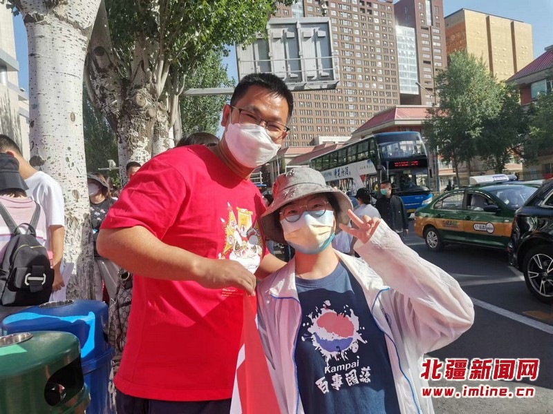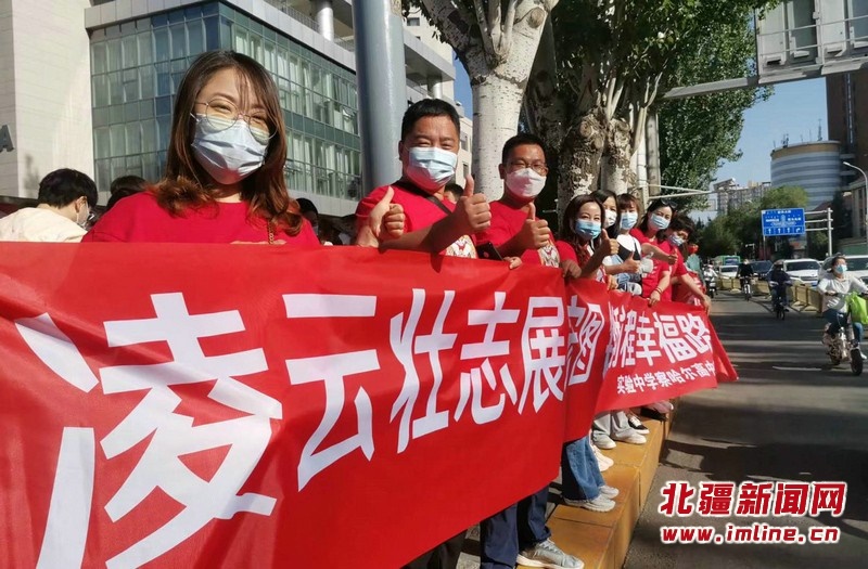 呼和浩特市實驗中學察哈爾校區(qū)的送考教師身穿旗開得勝的紅色T恤,戴印有“金榜題名”的紅色口罩為學生加油助威,并祝愿所有考生“凌云壯志展宏圖 錦繡前程幸福路”。