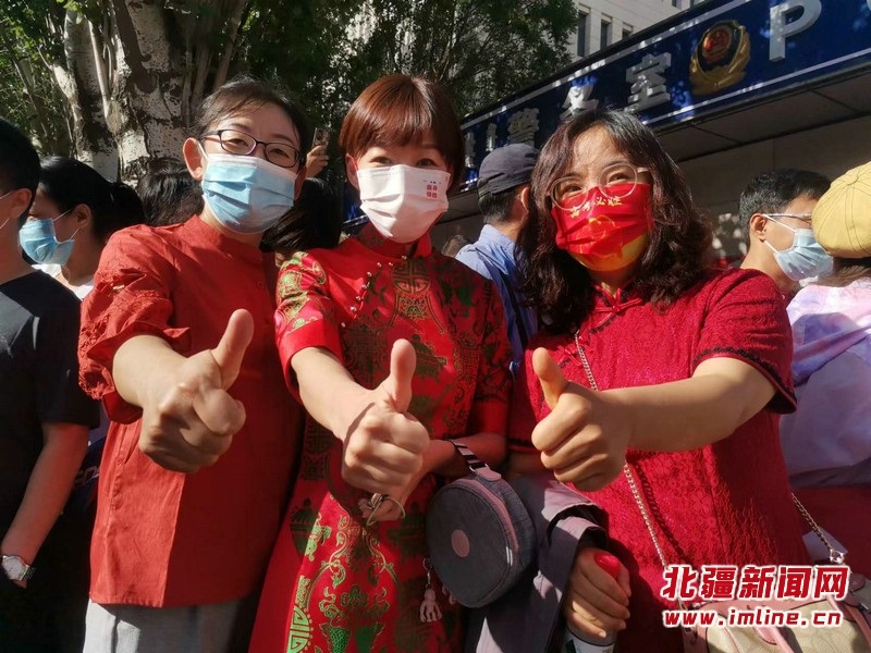 呼和浩特市第二中學和呼和浩特市土默特中學送考教師身著旗袍,祝愿孩子們“旗開得勝”。
