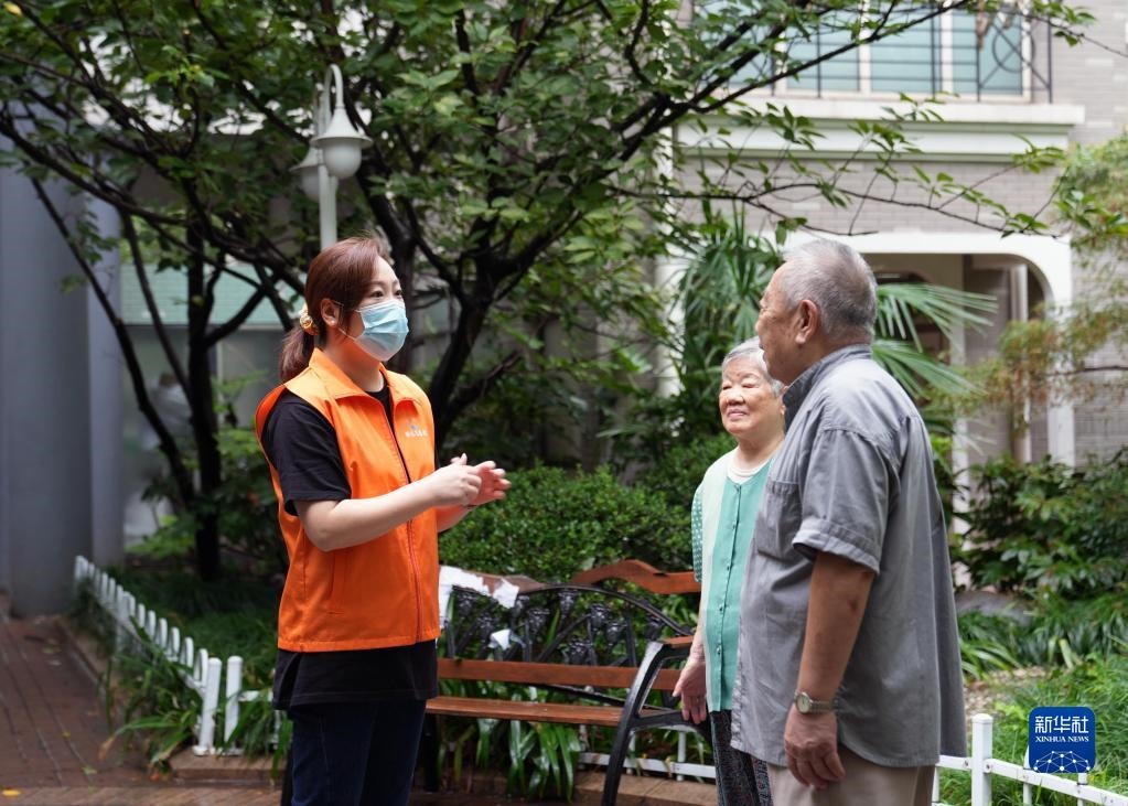在上海靜安區(qū)石門(mén)二路街道新??道铮用駞^(qū)黨總支書(shū)記魏瑛(左)在和居民交流(2022年9月15日攝)。新華社記者 劉穎 攝