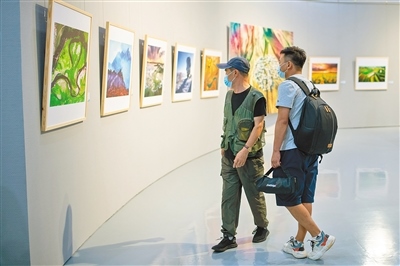 觀眾在觀看“亮麗北疆 向美而行‘伊利杯’內(nèi)蒙古風(fēng)光攝影展”。此次展覽共展出200件作品,既有獲獎(jiǎng)作品,也有特約的名家作品。 記者 懷特烏勒斯 攝