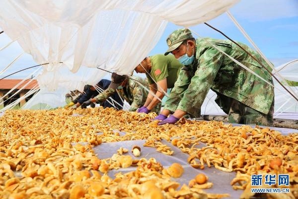 內(nèi)蒙古森工集團(tuán)阿里河森工公司齊奇嶺林場(chǎng)種植戶將采摘后的滑子菇進(jìn)行晾曬。新華網(wǎng) 石毅 攝